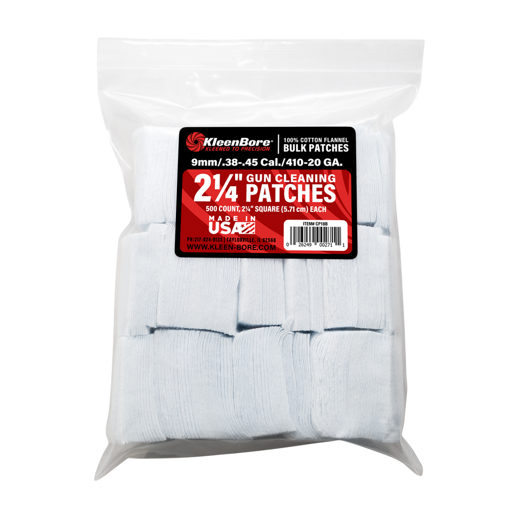These premium quality 100% cotton flannel patches provide maximum absorbency and bore protection. These patches are precision cut to ensure the proper fit and maximum cleaning performance when used with KleenBore jags.